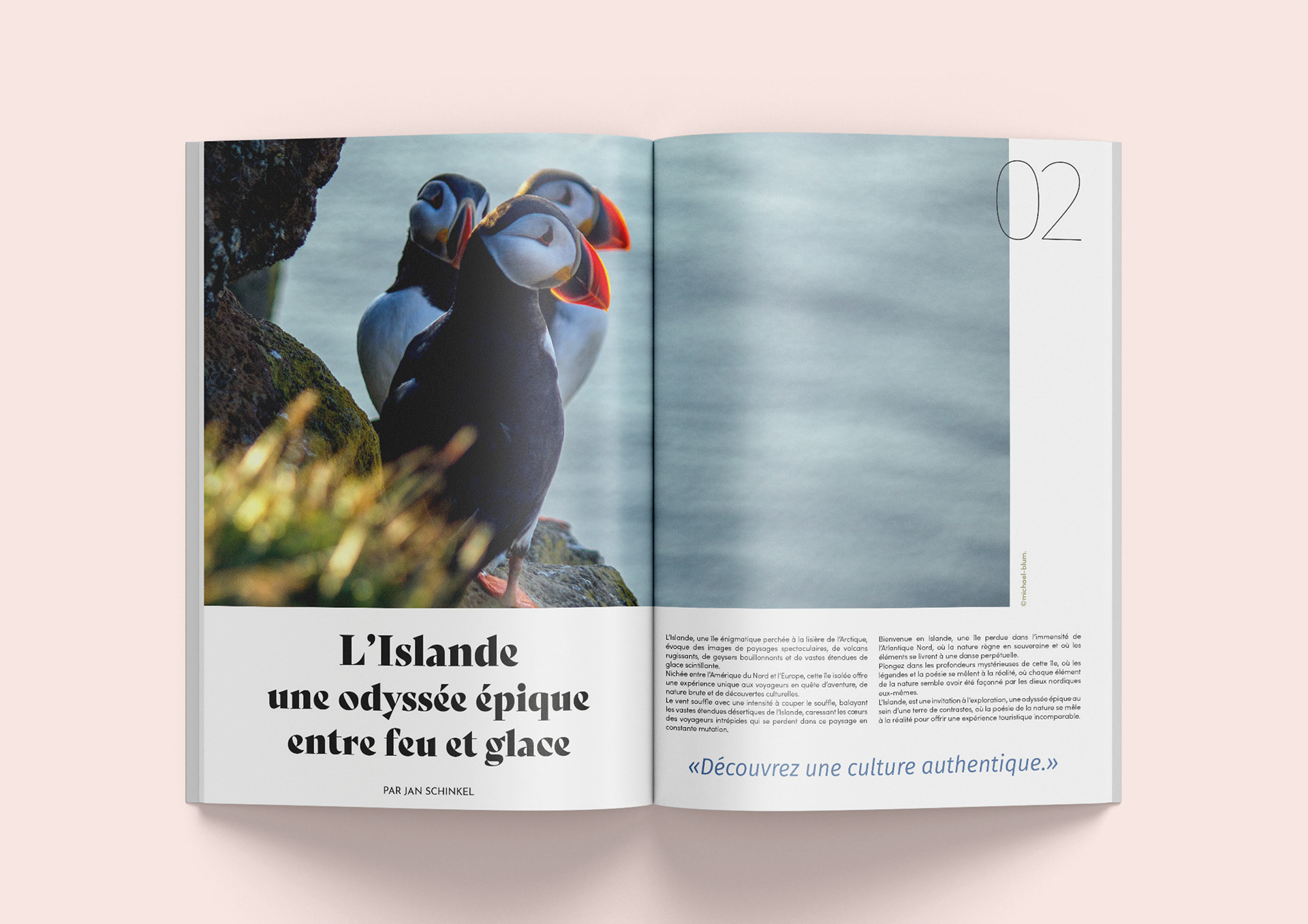 Réalisation d’un article de magazine life-style sur l’Islande, en prenant compte des systèmes graphiques du design éditorial.